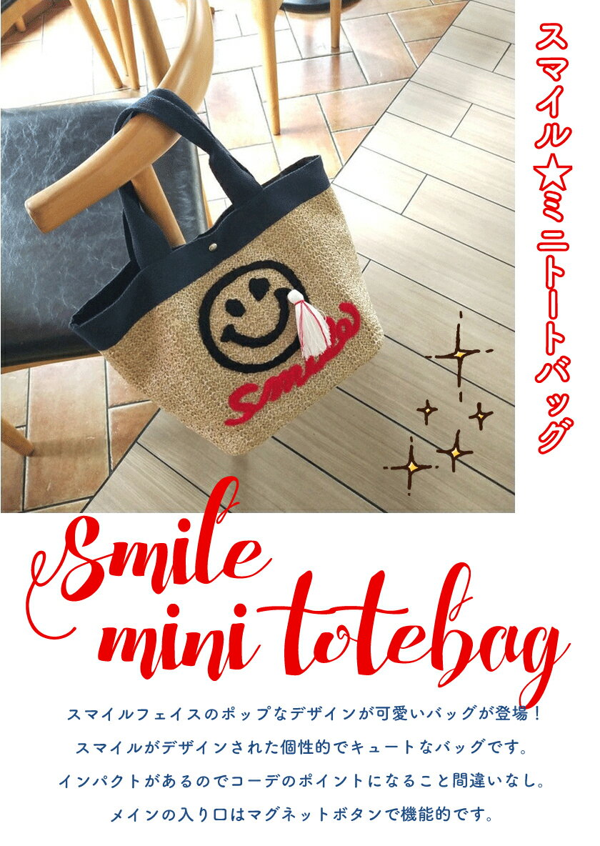 スマイル ミニトート 大きめ カゴバッグ にこちゃん刺繍 バスケット レディース バッグ バック 鞄 カバン トートバッグ トート カゴ バスケット バケツバッグ ゴルフトート カートカバン 巾着 刺繍 にっこり SMILE カゴバッグ 大容量 かわいい おしゃれ 買い回り 送料無料