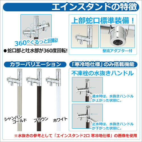 カラー ・シャンパンゴールド ・ブラウン ・ホワイト 仕様 1口水栓柱(不凍栓:寒冷地仕様/日本水道協会認定品/上部蛇口付/吐水部360度回転可能/GPシモク付属) 材質 アルミ(アルマイト仕上げ) セット内容 ウォータースタンド EIN ■エインスタンド 不凍栓 1口 L1000 不凍機能付タイプ ※ご購入時に選択いただいたお色の商品1点をお送りいたします。