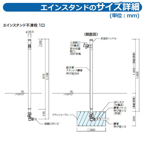水栓 立水栓 エインスタンド 不凍栓 1口 L1000 不凍機能付タイプ(水抜き機能:有り) ユニソン ウォータースタンド EIN 一口水栓柱 不凍水栓柱 寒冷地仕様 日本水道協会認定品