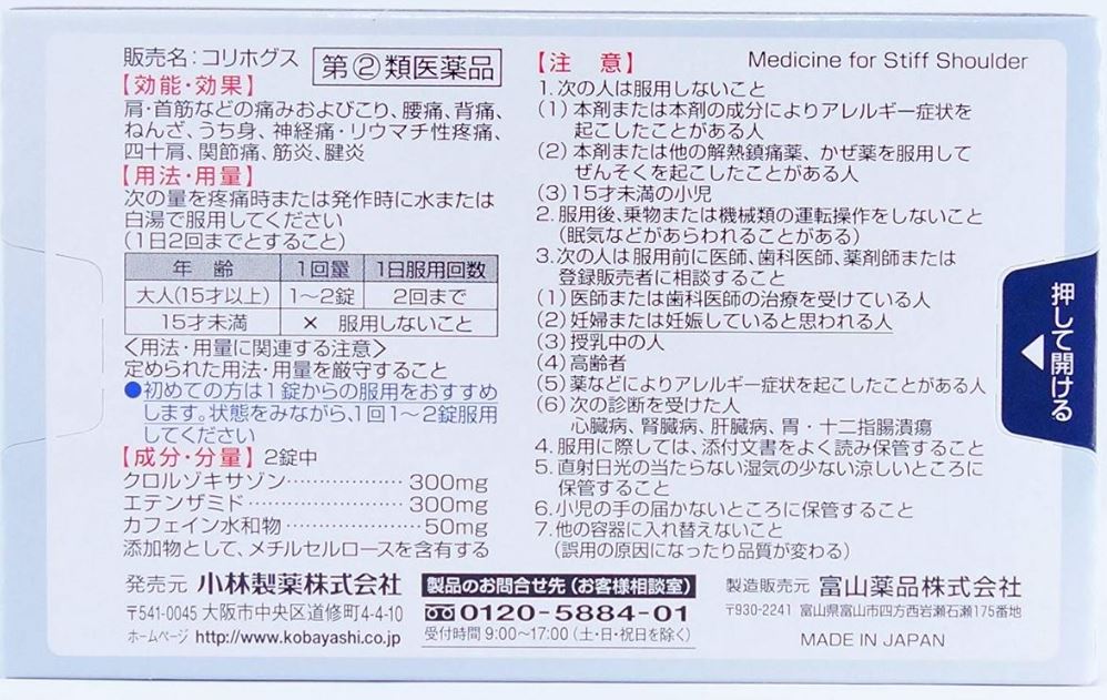 【成分表示】2錠中 クロルゾキサゾン 300mg エテンザミド 300mg カフェイン水和物 50mg ※添加物としてメチルセルロースを含有する 【コリホグスの効能効果】 肩・首筋などの痛み及びこり、腰痛、背痛、ねんざ、うち身、神経痛、リウマチ性疼痛、四十肩、関節痛、筋炎、腱炎 【コリホグスの用法・用量】 大人1回1〜2錠、1日2回、疼痛時または発作時に水または白湯で服用してください。