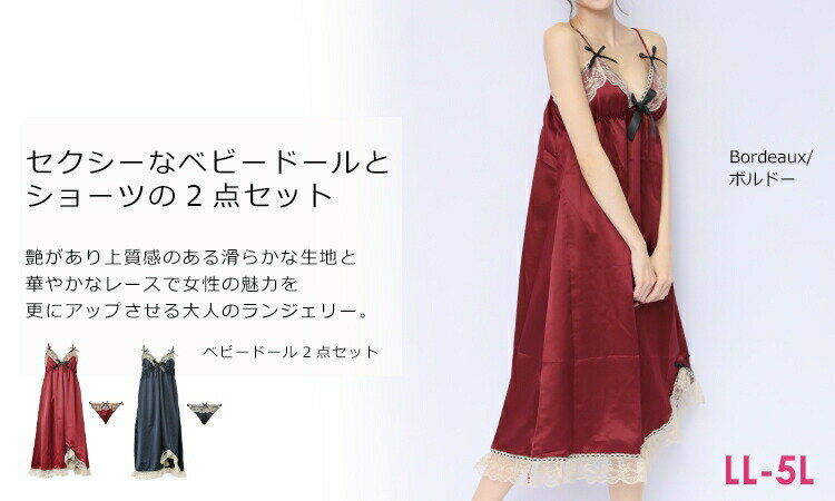 大きいサイズ レディース セクシーランジェリー ベビードールセット セクシー下着 レース リボン キャミワンピース キャミソール スリップ ロング丈 Aライン アジャスター ストラップ調節 肩紐調節可能 光沢感のある生地 つるつる さらさら 高級感 リッチ感 透けない ショーツ 紐パン サイドゴム 体型カバー 2点セット 魅惑的なライン 下着 パンツ パンティー ランジェリー ネグリジェ ルームウェア 部屋着 パジャマ エレガント インナー アンダーウェア 女性下着 婦人下着 インナーウェア アンダーバストゴム ウエストゴム 普段使い デイリー 勝負用 勝負下着 大人 きれいめ おしゃれ おすすめ 通販 かわいいデザイン 20代 30代 40代 50代 赤 レッド ワイン 紺 春 夏 秋 冬 LL 3L 4L 5L nm-all-in0005着るだけで気分があがる大人かわいいデザイン。