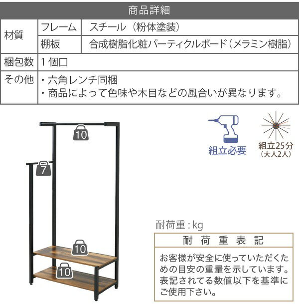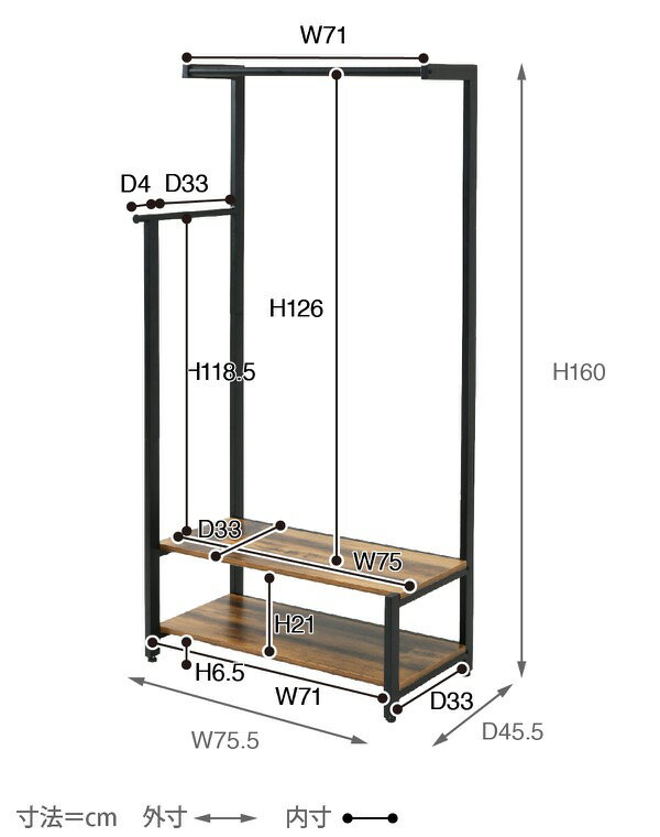 幅75×奥行45×高さ160cm[内寸]:(ハンガー大)幅71×高さ126cm(ハンガー小)奥行33×高さ88cm(フック)出幅4cm(棚間)幅71×奥行33×高さ21cm(脚間)幅71×奥行33×高さ6.5cm[フレーム]スチール(粉体塗装)[棚板]合成樹脂化粧パーティクルボード(メラミン樹脂)【耐荷重】[ハンガー大]約10kg以下[ハンガー小]約7kg以下[棚]各約10kg以下【収納数】[ハンガー大]約14〜23着[ハンガー小]約6〜10着・六角レンチ同梱・商品によって色味や木目などの風合いが異なります。