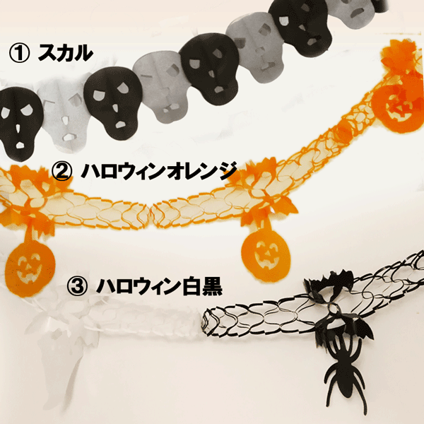■製品仕様/技術仕様 ■サイズ ※平置き状態 (1)スカル ・本体重さ(約):25g ・開封前サイズ:19cmx16.5cm ・開封後サイズ:160cm(紐を広げた長さ) ・厚み:1.5mm ・商品セット内容:本品1点(紐が通してある状態) ・素材:紙 ------------------------------------------ (2)ハロウィン オレンジ ・本体重さ(約):20g ・開封前サイズ:27cmx15cm ・開封後サイズ:最長280cm(紐を広げた長さ) ・厚み:2mm ・商品セット内容:本品1点(紐が通してある状態) ・素材:プラスチック ------------------------------------------ (3)ハロウィン 白黒 ・本体重さ(約):20g ・開封前サイズ:27cmx15cm ・開封後サイズ:最長260cm(紐を広げた長さ) ・厚み:2mm ・商品セット内容:本品1点(紐が通してある状態) ・素材:プラスチック 製品保証:3か月以内の初期不良