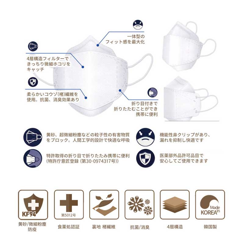 KF94プレミアムマスク 素材 (本体)不織布 韓紙 (ノーズフィッター)スチールワイヤー (耳紐)ナイロン カラー:WHITE 数量:5枚セット(個別包装) 生産地:韓国 KF94プレミアムマスク 各種ウイルス、黄砂、微細粉塵などの 粒子性の有害物質を遮断して、呼吸器を保護 KF94とは、0.4㎛以下の超微細粒子を94%まで 遮断すると認められた製品に与えられた認証 であり、韓国政府公認のマスクです。